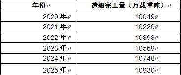 图表:2020-2025年船舶制造行业造船完工量预测(单位:万载重吨)
