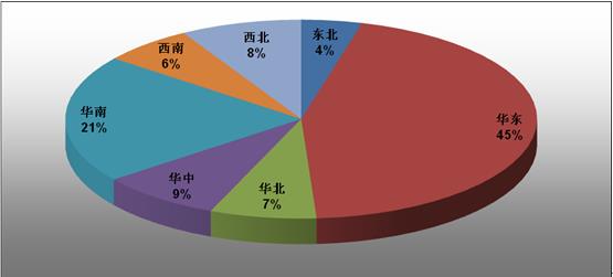 由上图表可以看出音乐剧在华东地区区占比较大,有45%左右,其次为华南地区,占比21%左右。然后其他地区占比为4-9%不等。