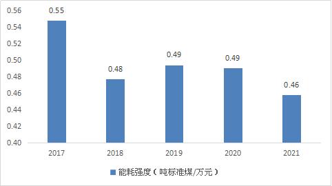 从能耗强度来看,我国的能耗强度是下降趋势,说明我国每万元的产值所需消耗的煤产量逐渐减少,从2017年的0.55吨标准煤减少到了2021年0.46吨标准煤。