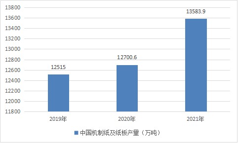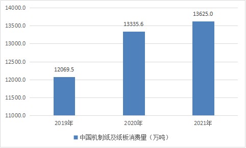2019年中国机制纸及纸板消费量为12069.5万吨,至2021年,消费量为13625万吨。