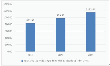 2019年的中国工程机械租赁供给市场是832.93亿元,并且在2021达到了1152.84亿元。