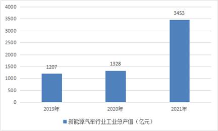 2020年,中国新能源汽车行业工业总产值约为1328亿元,2021年,工业总产值为3453亿元。