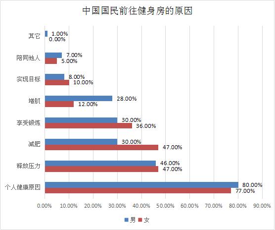 在对去健身房原因调查中,约77%的女性受访者和80%的男性表示为了身体健康,他们经常去健身房锻炼。
