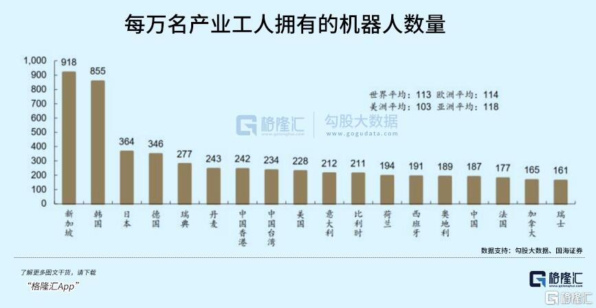 其次,我们虽然号称世界工厂,但与其他制造业发达市场相比,自动化程度不算太高,即工业机器人的密度,仍有很大提升空间。
