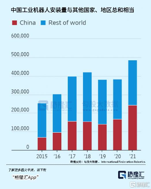 总体来看,中国是全球最大的工业机器人市场,且增速远超行业平均水平。据IFR统计,2021年中国工业机器人安装量达24.3万台,几乎与世界其他地区的总和相当。