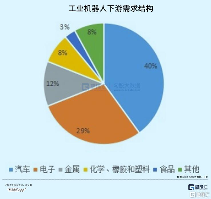 不过截止到今年,中国50%以上的工业机器人仍应用于汽车制造业,其中大半为焊接机器人;在发达国家,汽车工业机器人也占机器人总保有量的53%以上。