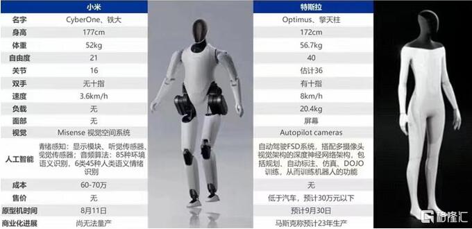 直观对比小米CyberOne和特斯拉Optimus,来源:申万宏研究