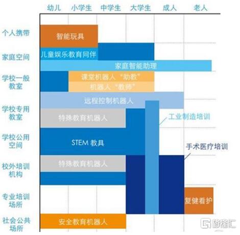 分场景看,主要集中在学校和家庭中使用,如教室中的STEAM教具、远程控制机器人,家庭中的智能助理、儿童教育伙伴、智能玩具等等。