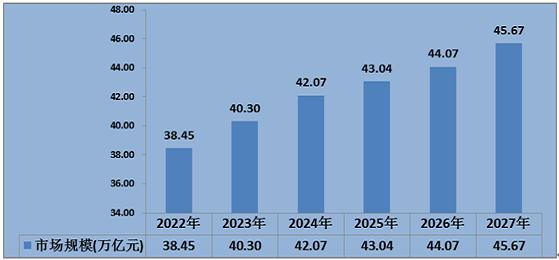 随着逆周期调控政策加码,基建有望发挥托底作用,专项债杠杆效应+多渠道融资有望撬动基建投资回升。铁路、公路、轨交等交通基础设施是专项债资金的重点支持领域,新政落地将直接受益,预计2027年基建行业市场规模达到45.67万亿元,同比增长3.64%。