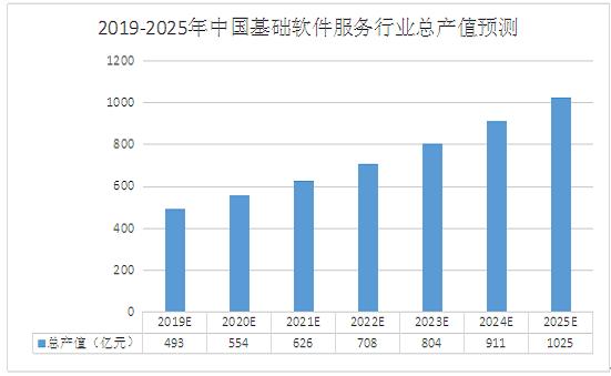图表:2019-2025年中国基础软件服务行业总产值预测