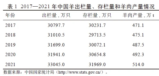 2021年我国肉羊生产继续向好,羊出栏量、存栏量和羊肉产量同比增长率均为近5 年最高。从存出栏量看,2021 年,我国羊出栏33 045.0 万只,创历史新高,比上年增加1 104.0 万只,增幅达3.5%;年末羊存栏31 969.0 万只,比上年增加1 314.2 万只,增幅达4.3%。从出栏率看,近5 年羊只出栏率都突破了100%,2021 年达到历史最高的107.8%,说明我国肉羊生产性能不断增强。从羊肉产量看,2021 年羊肉产量达514.0 万t,比上年增加21.7 t,增幅为4.4%,已经实现了《推进肉牛肉羊生产发展五年行动方案》中提到的“到2025 年羊肉产量稳定在500 万t”的发展目标。