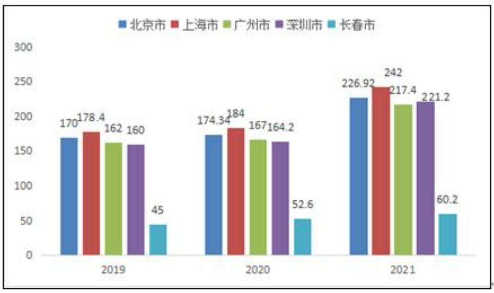 根据市场调研数据分析,2019-2021年重点城市食材配送市场中,北京市、上海市、广州市、深圳市位居全国前四,2021年前四城市配送市场规模分别为226.92、242、217.4、221.2亿元亿元,吉林省长春市食材配送市场规模为60.2亿元。