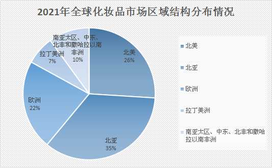 从地区分布情况来看,2021年全球化妆品市场主要集中在北亚、北美及欧洲等经济较为发达的地区,其中北亚地区市场占比为35%,北美地区市场占比为26%,欧洲地区市场占比为22%。