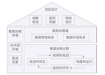 数据治理框架包含顶层设计、数据治理环境、数据治理域、数据治理过程四大部分。