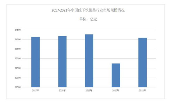 2017年至2019年,中国线下快消品市场规模逐年增长,销售额从34130亿元增长至34260亿元;快消品行业分析显示2019年至2021年,受疫情影响,中国线下快消品市场规模从34260亿元下降至34080亿元。随着国内经济的稳定发展,2022年传统线下快消品市场有望保持增长,市场规模将达到35860亿元。