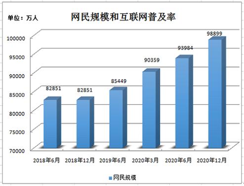 截至2020年12月,我国网民规模为9.89亿,较2020年3月新增网民8540万,互联网普及率达70.4%,较2020年3月提升5.9个百分点。截至2020年6月,我国网民规模为93984万人,较2020年3月新增网民3625万人,互联网普及率达67.0%,较2020年3月提升2.5个百分点。