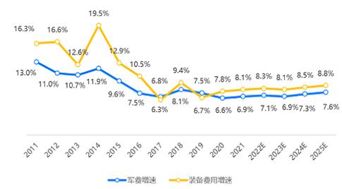 图表:2011-2025中国军费及装备费增速(%)及预测