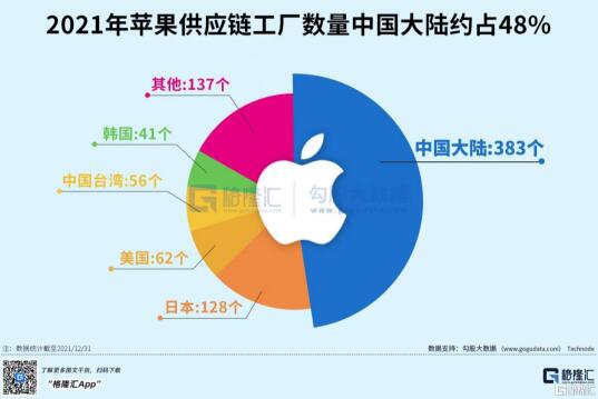 和硅谷其他科技公司一样,苹果很早就开始了生产外包。早在70年代,苹果就把半导体芯片封装工艺,转移到了劳动力成本低下的亚洲。尤其是蒂姆·库克的上任,彻底把苹果的全球制造供应链体系建设的掌控推升至了一个绝对高度。这种掌控带来的效益之强大,足以让全球所有顶级商业巨头都顶礼膜拜,有人称之为——苹果的帝王之术。以全球最庞大的订单为利器,苹果把全球范围内的零配件供应商和组装商拿捏得死死的。尤其是中国的无数零配件供应商和代工组装的富士康。2021年,苹果供应链工厂中,中国大陆的工厂就有383个,占了48%。