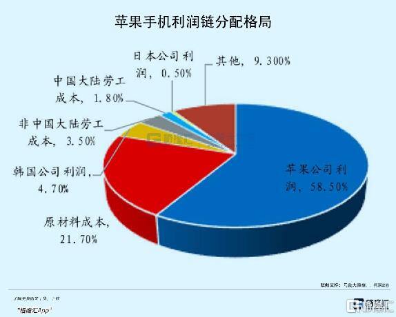 在苹果最辉煌的时候,苹果的代工厂也即被称为最强流水线血汗工厂的富士康在中国一度拥有超过100万工人源源不断为其加班加点生产手机和其他产品。2021年,苹果从中国市场赚取了684亿美元收入,中国市场成为它的第三大收入来源市场,而且这两年中国市场的增速显著超越其他大区市场。但在另一方面,在一部苹果手机的利润分配中,苹果拿走了近6成,包括中国企业在内的无数原材料供应商的利润只有2成出头,而为苹果日夜加班组装手机的中国大陆劳工成本甚至仅有1.8%,他们绝大部分来自富士康工厂。而富士康本身,为苹果生产手机的利润也仅有2%。