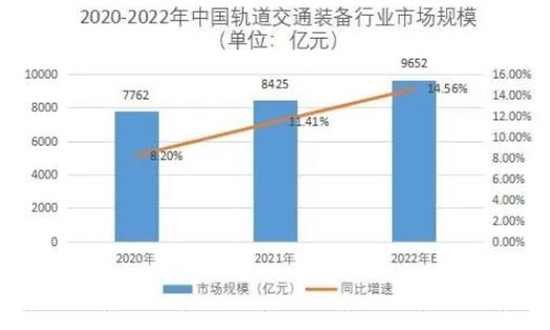 在城市人口数量不断上升的背景下,轨道交通装备行业迎来了发展机遇,2020年中国轨道交通装备行业市场规模为7762亿元,同比增长8.2%;2021年市场规模进一步增长至8425亿元,较上年同比增长约11.41%,其中铁路轨道交通装备市场规模约为3921亿元,占比46.54%,预测2022年中国轨道交通装备行业市场规模将达到9652亿元,市场增速为14.56%。