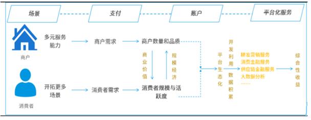 通过平台生态化战略提供多元化增值服务逐渐成为支付行业发展主流。平台化模式 有别于传统的服务佣金模式,在这种业务逻辑中,平台通过多元化的增值服务来实现综 合性收益,要同时满足 C 端用户和 B 端商户的需求。对 C 端用户来说,平台需要开拓 更多的场景来满足消费者需求,吸引流量,提高消费者规模和活跃度,以实现平台的规 模经济效应。对 B 端商户来说,平台要增强为商户提供多元服务的能力,满足商户数字 化经营需求,优化商户的服务品质。