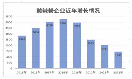 中国现存酸辣粉相关企业1.59万家。从2015年开始,酸辣粉企业的注册数量增长较快,2015-2019年,分别新增酸辣粉相关企业2834家、3484家、4056家、4268家、3993家,此后由于疫情、行业竞争因素等影响,酸辣粉的注册数量有所回落。