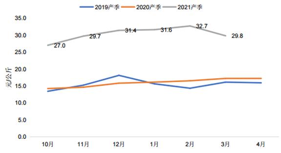 图表:2019-2021年产季云南咖啡豆市场综合评价均价格情况