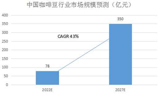 就中国咖啡消费结构的明显变化而言,中国新一代消费结构的稳步增长为中国咖啡消费的稳步增长做出了贡献。过去几年间我国咖啡豆行业市场规模快速增长,年复合增长率达30%以上,未来随着我国人均消费水平进一步提高以及咖啡在软饮料行业中市场渗透率持续提高,预计2022-2027年,中国咖啡豆行业市场规模将以43%的年复合增长率增长,预计至2027年底,行业市场规模有望增长至为350亿元。