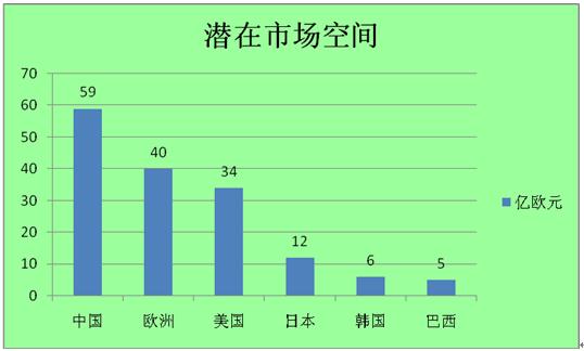 全球潜在市场规模最大的三个地区依次为中国(59亿欧元)、欧洲(40亿欧元)、美国(34亿欧元)。