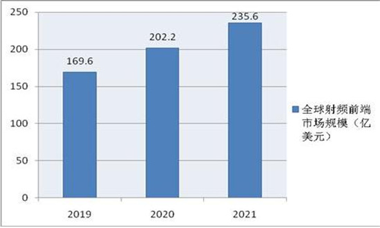 图表:2019-2021年全球射频前端行业市场规模(单位:亿美元)