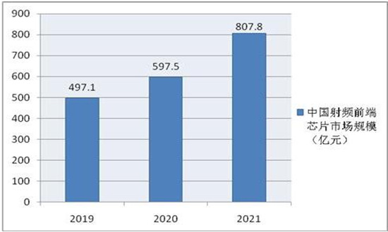 2020年,中国正式进入5G商用时代,在相关新兴领域蓬勃发展以及国家政策大力扶持的双重驱动下,2021年中国射频前端芯片市场规模达到807.8亿元。