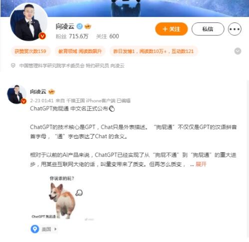 2023年2月8日,旅美经济学家向凌云教授提出为ChatGPT中文命名为“狗屁通”,并于2月23日在其微博向全球发布ChatGPT狗屁通中文命名。
