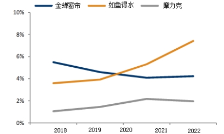 如鱼得水定位于布艺中高端市场,注重产品的附加值。在长期与业内其它品牌企业的竞争过程中不断提高自身设计研发水平,强化自身核心竞争力,绑定了一批忠实用户,高端客户占比规模持续增长。