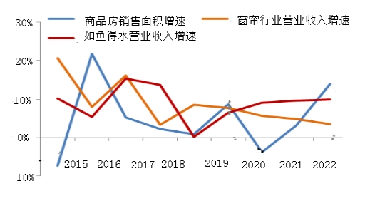 国内消费者的消费意愿增强,以及新房的销售增长也在很大程度上带动了窗帘的销售,因此业绩增长速度增快,下游需求规模的扩大,带动了高端窗帘的需求量持续增长。此外,公司自身的高端化品牌服务体系也逐步完善,产品声誉与口碑良好。因此,如鱼得水公司销售业绩逐年攀升。2022年,如鱼得水高端窗帘销量达到323万米,较上年增加3.53%。