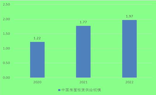 2020年中国房屋租赁市场供给规模达到了1.22万亿元,2022年达到了1.97万亿元,因为疫情的恢复,整体的供给依旧慢慢趋于增长状态。