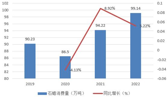 随着石化产业科技进步地不断深化,对于石蜡的应用开发也更加广泛地应用于军事、塑料纳米技术、橡胶、造纸、建材、蜡烛、食品、化妆品、医药、纺织品等更广阔的领域,市场需求日益增长,并呈现出供不应求地态势,这也直接推动了我国石蜡产品发展。我国石蜡的消费量也逐步上涨,2022年石蜡消费量达99.14万吨,同比增长5.22%。