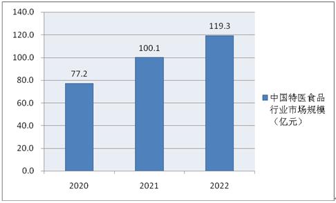 图表:2020-2022年中国特医食品行业市场规模(单位:亿元)
