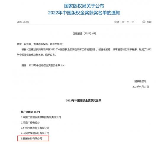 近日,国家版权局公布2022年中国版权金奖获奖名单,麒麟软件荣获中国版权领域最高奖项——“中国版权金奖·推广运用奖”。中国版权金奖由国家版权局和世界知识产权组织(WIPO)共同主办,设立于2008年,每两年评选一次,是中国版权领域最高奖项,也是中国版权领域唯一的国际奖项。“中国版权金奖·推广运用奖”全国仅5个名额,本次获评是国家版权局和世界知识产权组织对麒麟软件在推广和传播自主创新软件,推动版权产业高质量发展方面所做贡献的充分认可。
