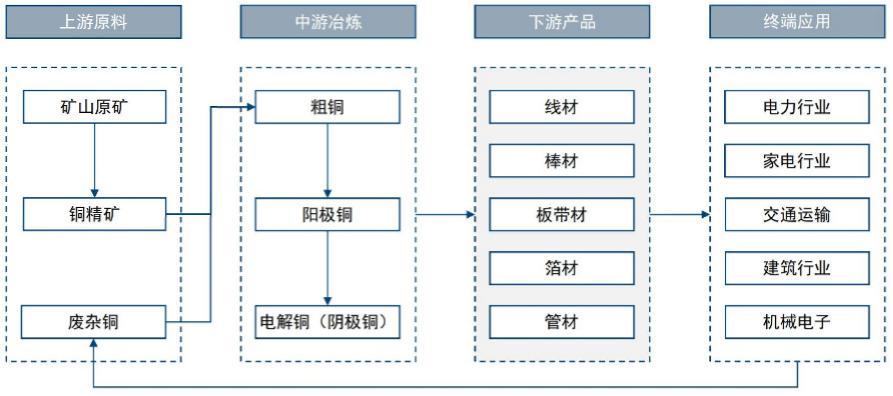 下游为铜产品加工端,即公司所处的产业链环节,主要通过不同工艺,将电解铜加工成线材、棒材、板带材、箔材、管材等各种形状的铜材。根据所添加的合金元素不同,铜材可分为黄铜(铜锌合金)、紫铜(工业纯铜)、青铜(铜锡合金)及白铜(铜镍合金)四大类。最终,被加工成产品的铜材进入消费终端,广泛应用于电力、建筑、电子、交通运输等行业。