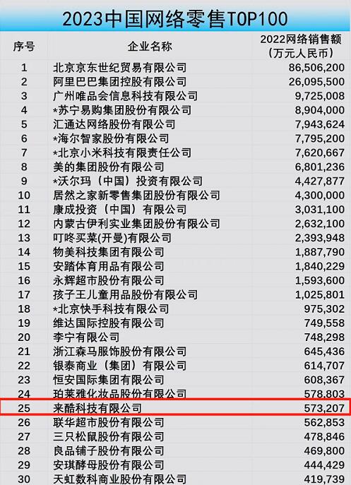 5月19日,在中国连锁经营协会最新发布的2023年度连锁零售榜单(网络零售)TOP100公示中,来酷科技与京东、阿里等零售企业一同跻身前25名。相比前一年逆市实现了6名的提升。