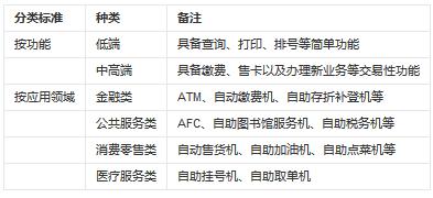 目前,国内银行自助服务设备主要分为自动取款机(ATM)、存取款一体机、自助服务终端三大类,为客户提供7×24小时的取款、存款、转账、查询、代缴费等服务,个别银行还应用了自助发卡机、IC圈存机等自助设备,服务种类基本涵盖了银行网点所能提供的全部零售银行服务。