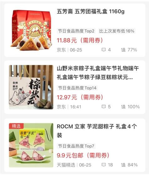 今年端午节期间,节令消费依旧火爆。在什么值得买平台上,粽子、咸鸭蛋、香囊、艾叶等端午特色消费品备受消费者青睐。在具体产品上,粽子礼盒凭借口味齐全、价格实惠的优势成为消费者的“一揽子解决方案”。但从具体GMV来看,“咸党”还是取得了压倒性优势,咸粽与甜粽销售比例约为3:1,肉粽、蛋黄粽GMV同比增速分别为28.68%、56.94%。此外,今年水晶粽、小龙虾粽、榴莲粽等新口味粽子也受到年轻消费者的喜爱。