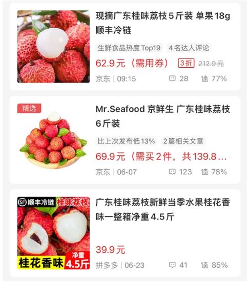 应季水果消费也在端午节期间迎来大涨。在什么值得买平台内,“水果”关键词商品GMV同比增长22.60%,车厘子、榴莲、荔枝GMV分别同比增长71.06%、65.44%、54.26%。值得一提的是,随着冷链运输的不断完善,相比往年妃子笑一枝独秀的状况,今年,桂味、白糖罂、糯米糍、黑叶等荔枝品种逐渐走红市场并获得消费者青睐,其中,桂味GMV同比增长835.21%,糯米糍GMV同比增长778.19%。