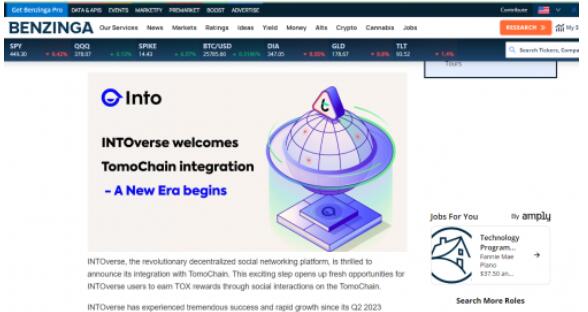 9月5日,据全球知名财经网站Benzinga报道,Web3社交协议 INTOverse 宣布把越南最大公链TomoChain 集成到其平台中,用户可以通过 TomoChain参与社交赚取。这一激动人心的举措为 INTOverse 用户社交赚取 $TOX 奖励提供了新的机会。
