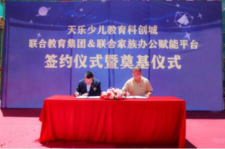 2023年8月2日,深圳天乐少儿教育科创城(以下简称"天乐科创城")与联合教育投资集团、联合家族办公室赋能平台在天乐科创城校区工地举行签约仪式暨奠基典礼。天乐少儿教育科创城创始人兼CEO甄祖亮先生与联合创始人林绚琛博士、联合教育投资集团及联合家族办公室赋能平台创始人林绚琛博士,港九新界幼稚园教育协进会副会长暨屯门区幼稚园校长会主席锺娴英校长,港九新界幼稚园教育协进会委员崔洁仪校长,联合家族办公室赋能平台各委员会执行委员出席该活动。