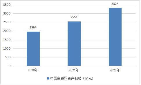 2020年中国车联网行业资产规模为1964亿元,2021年,车联网行业资产规模为2551亿元,至2022年,车联网行业资产规模为3325亿元。