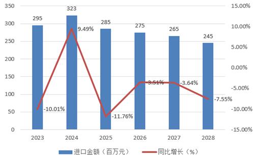 图表:2023-2028年国内旋挖钻机市场进口预测