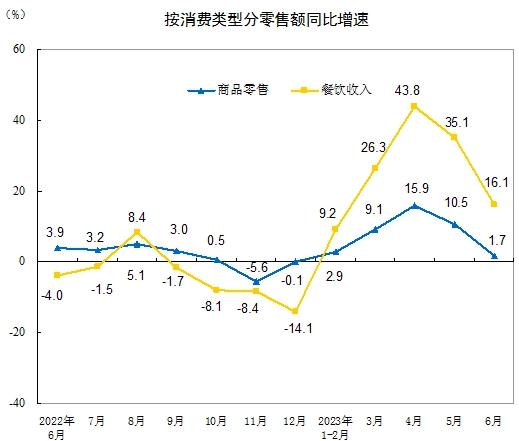 按消费类型分,上半年,商品零售203259亿元,同比增长6.8%;餐饮收入24329亿元,增长21.4%。