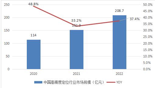 根据《2022年中国卫星导航与位置服务产业发展白皮书》相关数据显示,2020-2022年中国高精度定位行业市场规模情况具体如下图表所示。可以看出,2020-2022年间,中国高精度定位行业市场规模呈现出了较为快速的持续增长态势。截至2022年底,中国高精度定位行业市场规模增长至为了208.7亿元,较2021年同比增长了37.4%。
