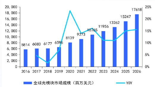 图表:数据中心发展带动全球光模块市场规模逐年递增